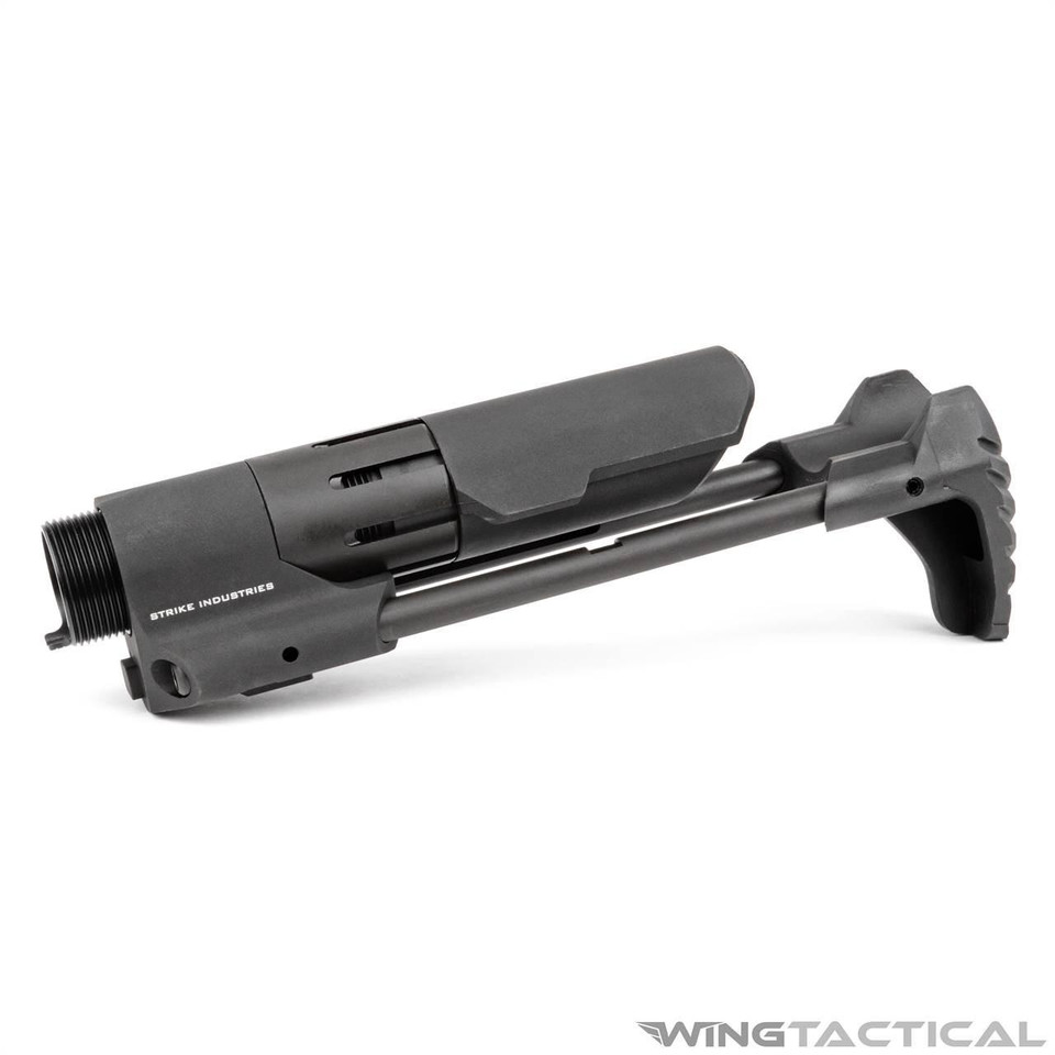 The Strike Industries PDW Stock features a push button system for deployment. It comes with its own buffer tube and buffer system to allow a standard bolt carrier group to run reliably even with its compact design. The extended cheek rest ensures the user has a comfortable cheek weld even when the stock is fully extended. It’s available in black and flat dark earth.