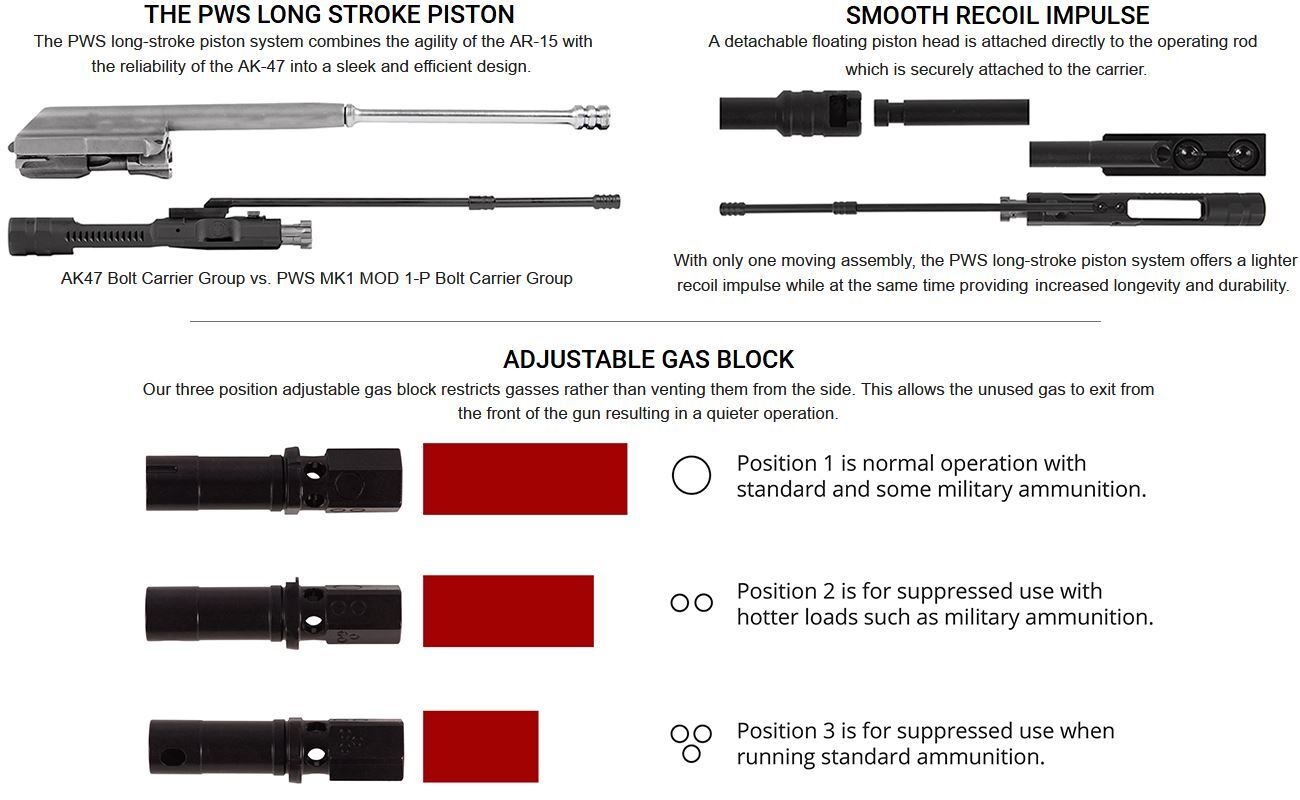 - PWS pistol-length long-stroke piston system - combines the agility of the AR-15 with the reliability of the AK-47 into a sleek and efficient design