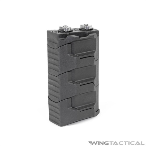 This foregrip is angled at 86 degrees and has a lightweight yet durable design. It is made from an impact-resistant custom blended Polymer made by Strike Industries. The Stacked Angled Grip also features an innovative cable management system, which allows shooters to route their laser and flashlight cables through the Strike Industries Stacked angled foregrip for better organization. Wires can be rounded alongside the grip, at 90-degree angles, and in U-shapes using the grooves on the attachment surface of the Strike Stacked Angled Grip.