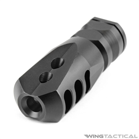 This muzzle brake has three large angled ports on each side, which redirect the gasses from the muzzle to decrease the perceived recoil and muzzle rise significantly. The gasses from the muzzle are also directed away from the ground so that there is no muzzle blast signature on the ground when you shore shooting prone. Overall, the port design is catered to work for both left and right-handed shooters.