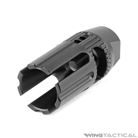 Just like its larger counterpart, the Phase 5 littleBOY Hex brake sets back into your hand guard, giving your rifle a sleek on-piece silhouette. The littleBOY carries the same aggressive look as the FATman but blends in well with its Mil-Spec black parkerized finish. The littleBOY for 5.56 and .223 is just 2.5-inches long and weighs only 5.3-ounces saving the competition shooter a full inch in length and over half an ounce in weight. Phase 5 furnishes a crush washer with their brakes so can easily install the littleBOY when you take it out of the box. Timing of the hexagonal littleBOY is simplified by the flat-planed styling that allows the armorer to use a level to find true 12 o’clock.